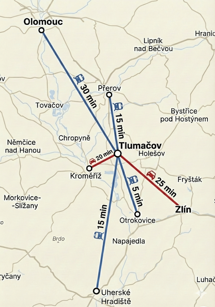 Do Zlína, Otrokovic, Přerova i Olomouce se dostanete rychle autem i vlakem. Blízkost dálnice D1.