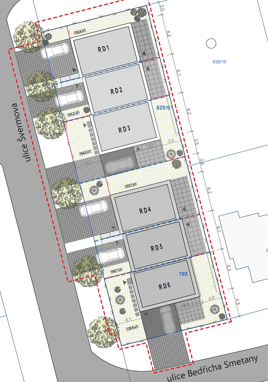 Rozmístění 6 rodinných domů RD1-RD6 na pozemku
